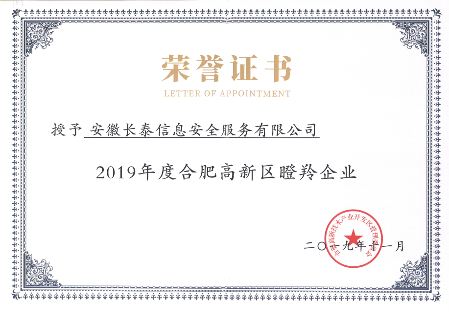2019年,11月20日,合肥高新区2019年高成长企业榜单正式发布,高新区共认定了502家高成长企业,其中雏鹰企业275家、瞪羚培育企业72家、瞪羚企业149家、潜在独角兽企业3家、独角兽企业1家、平台型龙头企业2家。作为其中的高科技企业——安徽MK体育在线登录-MK(中国)成功入选瞪羚企业榜单。